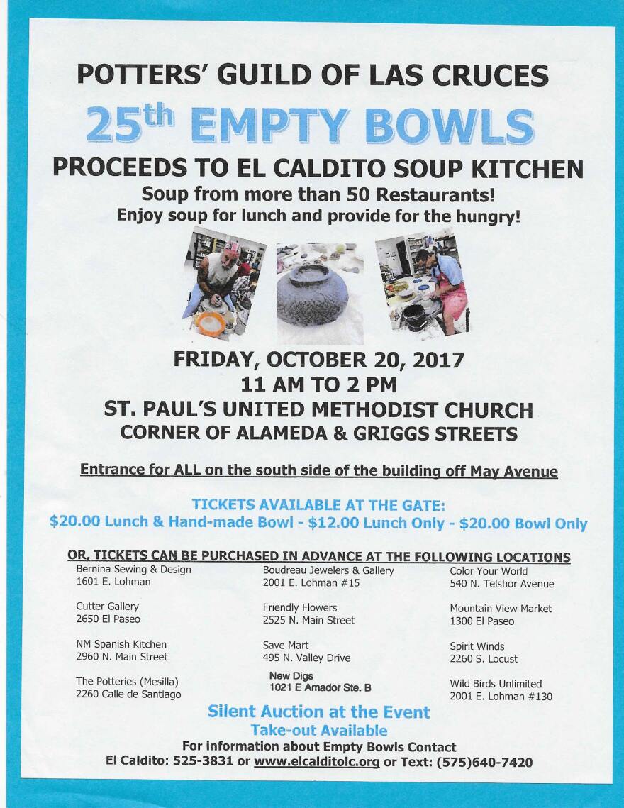 “Come in and enjoy soup for lunch and provide for the hungry,” take-out is also available. Bring your containers to share with others for take-out at El Caldito Soup Kitchen, 999 West Amador Avenue. For information and to learn more about volunteering and donating to the Empty Bowls luncheon and El Caldito Soup Kitchen call 575-525-3831, or visit at www.elcalditolc.org; and the Potters’ Guild of Las Cruces is at www.pottersguildlc.com. Both are also available on Facebook.