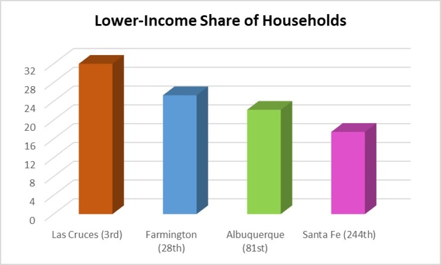 But wait, it gets worse. Las Cruces has the nation’s third-highest portion of households in the low-income category. Farmington’s not too far behind (28th), with Albuquerque (81st) and Santa Fe (244th) faring somewhat better: