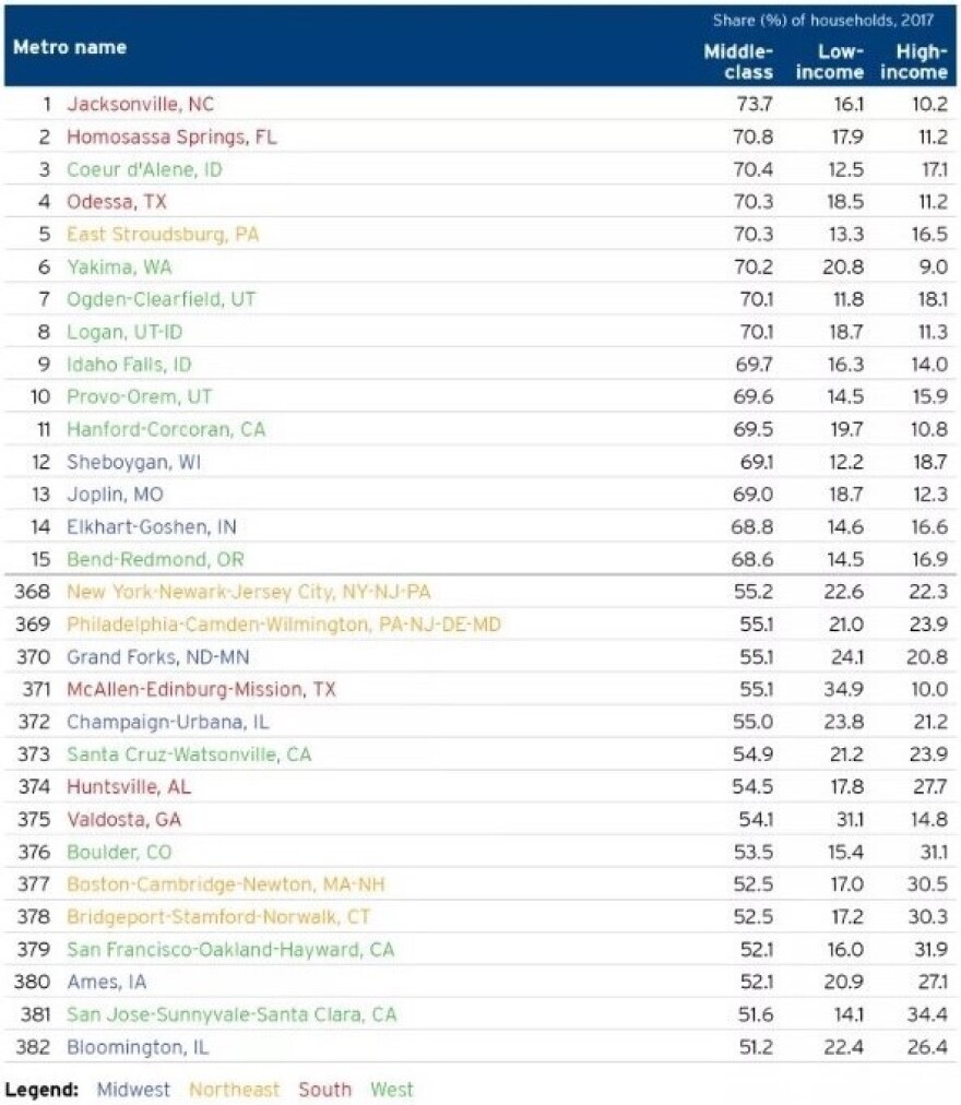 Researcher Alan Berube analyzed urbanized America’s middle class — defined as “the middle three quintiles of the national income distribution” — adjusted for the Bureau of Economic Analysis’s regional price parities and average household size.