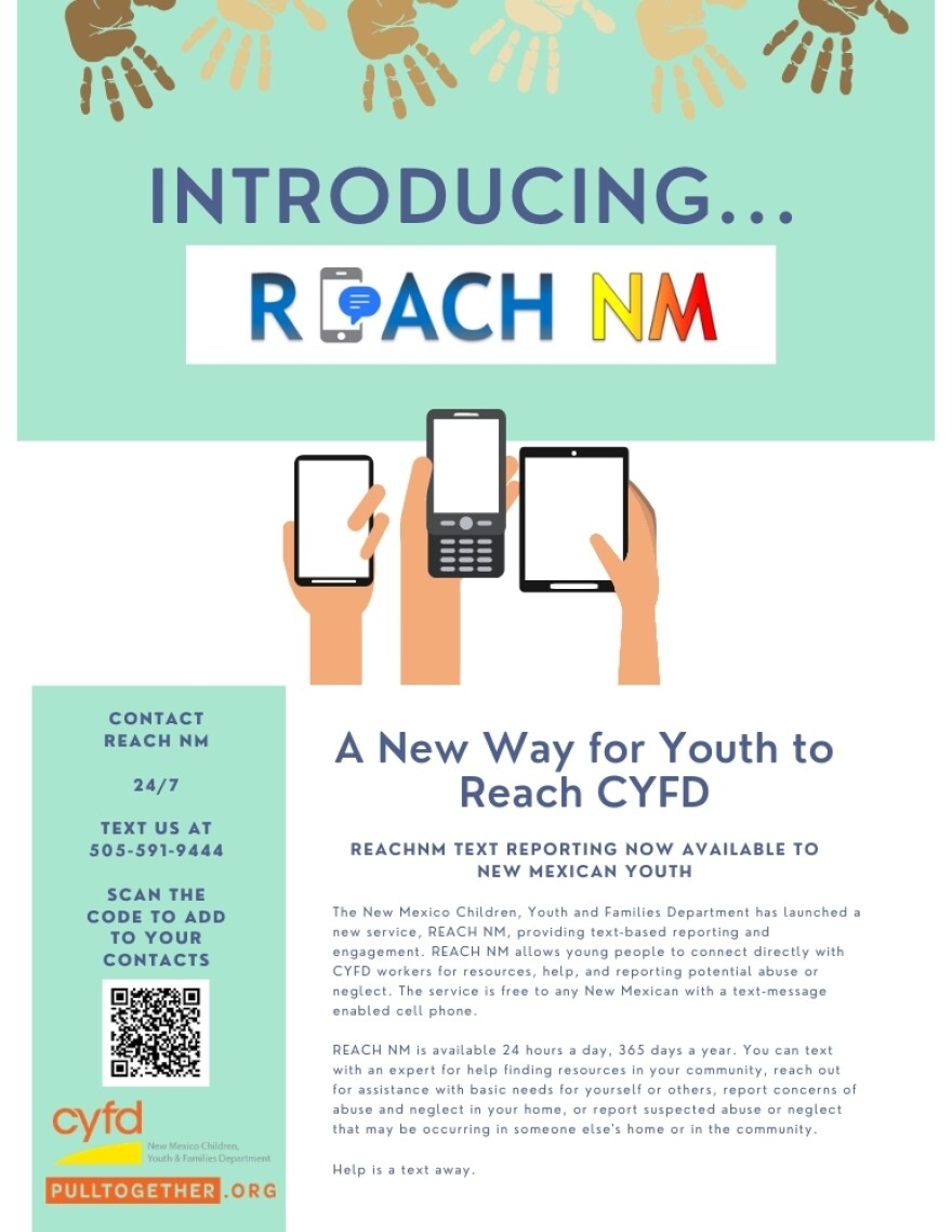 Reach NM -New Mexico Youth and Families Department – CYFD - Text messages at 505-591-9444; or visit cyfd.org.
