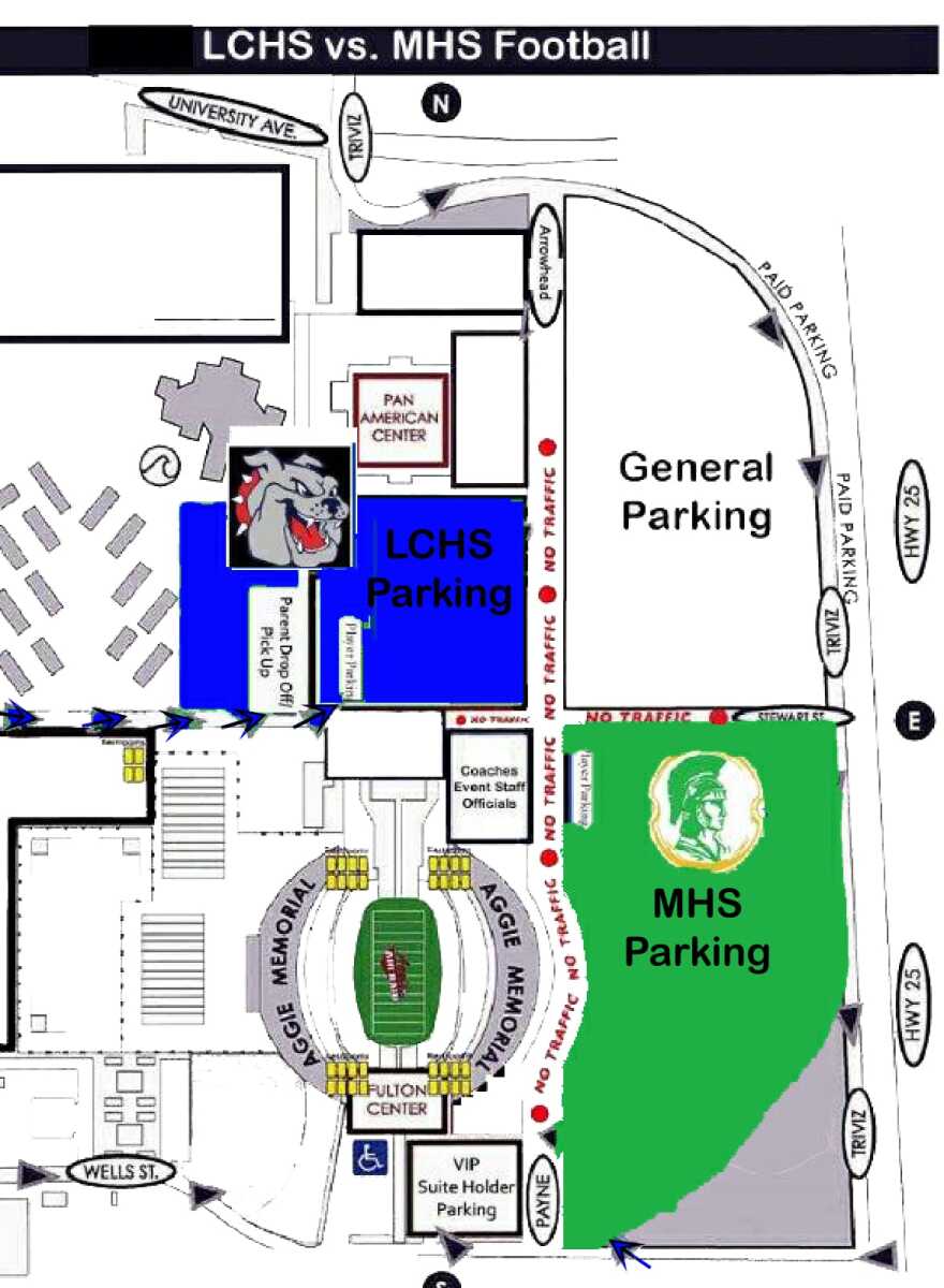 Traditionally, hundreds of fans tailgate before the game in specified NMSU parking lots. Viramontes said pregame tailgating is allowed on Friday from 4 to 7 p.m. Las Cruces High School fans will use lots #33 and #38, immediately north of the stadium, while Mayfield High School fans will use lot #34, immediately east of the stadium.
