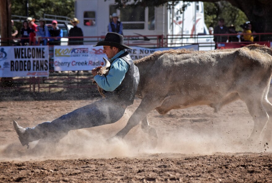 Tyler Muth, junior from Murrieta, California, wrestled the average win in the steer wrestling. He finished fourth in the first round and third in the short-go.