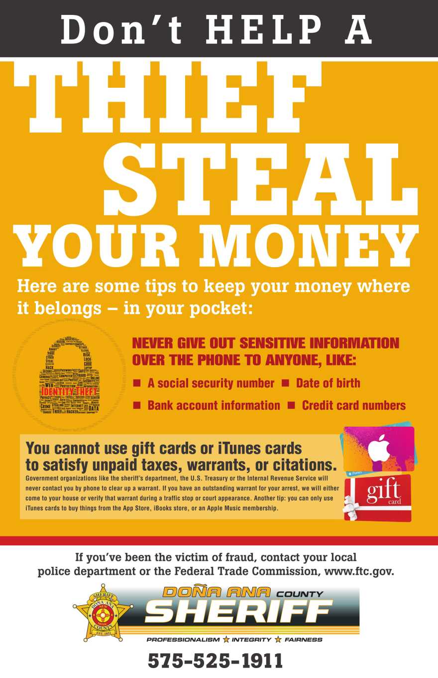 Brightly-colored posters in English and Spanish are going up in retail locations and government buildings all across Doña Ana County, thanks in part to county employees and volunteers with the Special Deputy Sheriff’s Commission. The message is simple: Don’t help a thief steal your money. Some of the tips include: