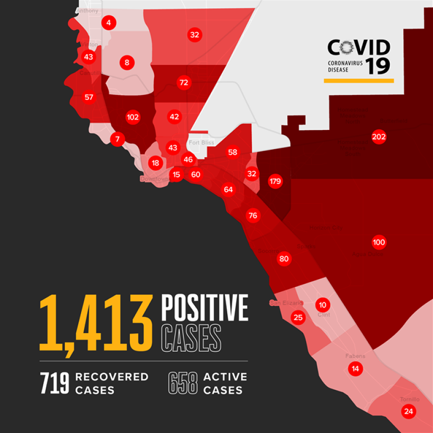 El Paso is also reporting 65 new COVID-19 cases bringing the county’s total number to 1,413.To-date 719 people have recovered from COVID-19. There are 658 active cases within the county. It is estimated that as of today more than 13,300 tests have been performed.