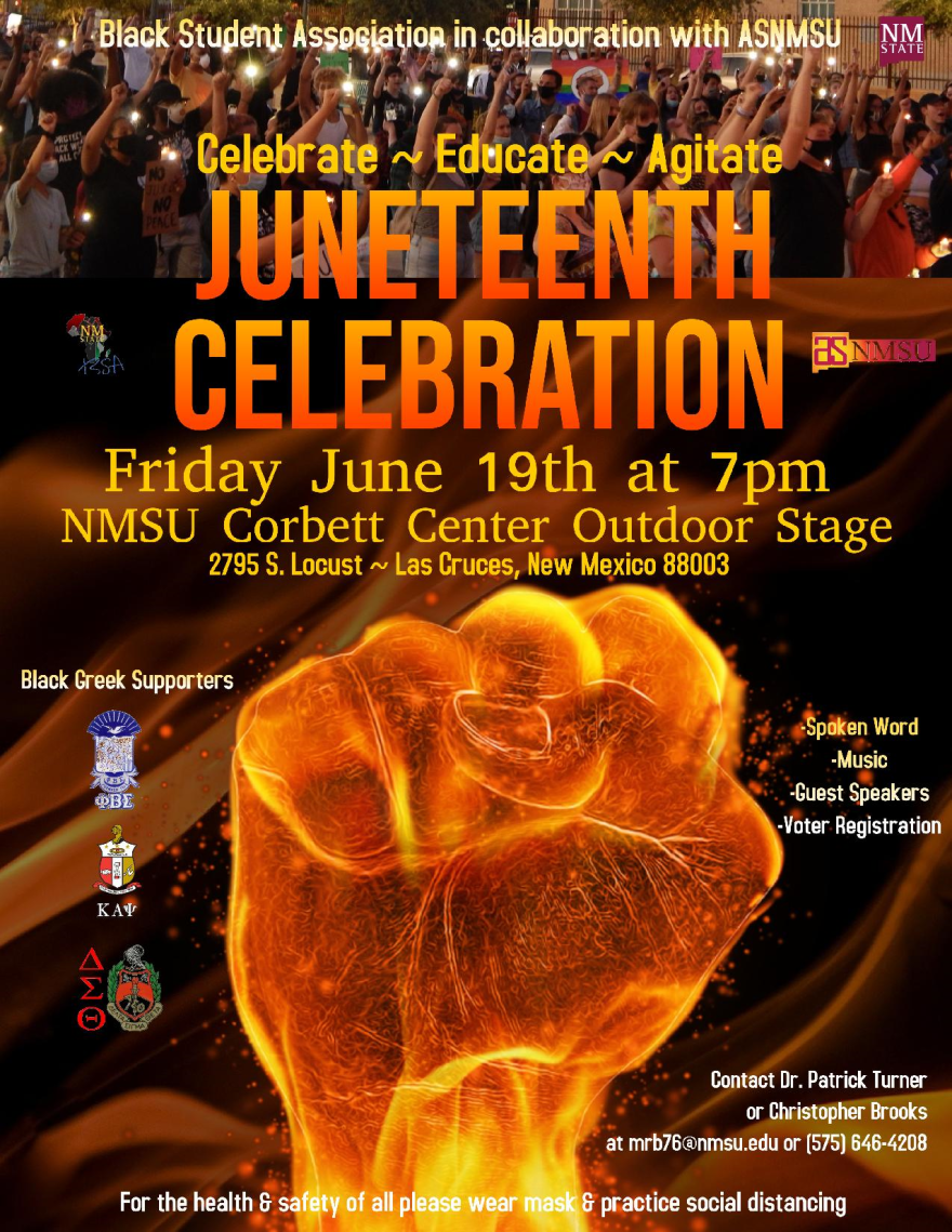 NMSU BSA and Black Programs, in collaboration with the Associated Students of NMSU, will host a Juneteenth celebration from 7 to 8:30 p.m. Friday, June 19, at the outdoor stage located at Corbett Center on NMSU’s Las Cruces campus.